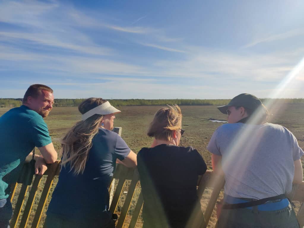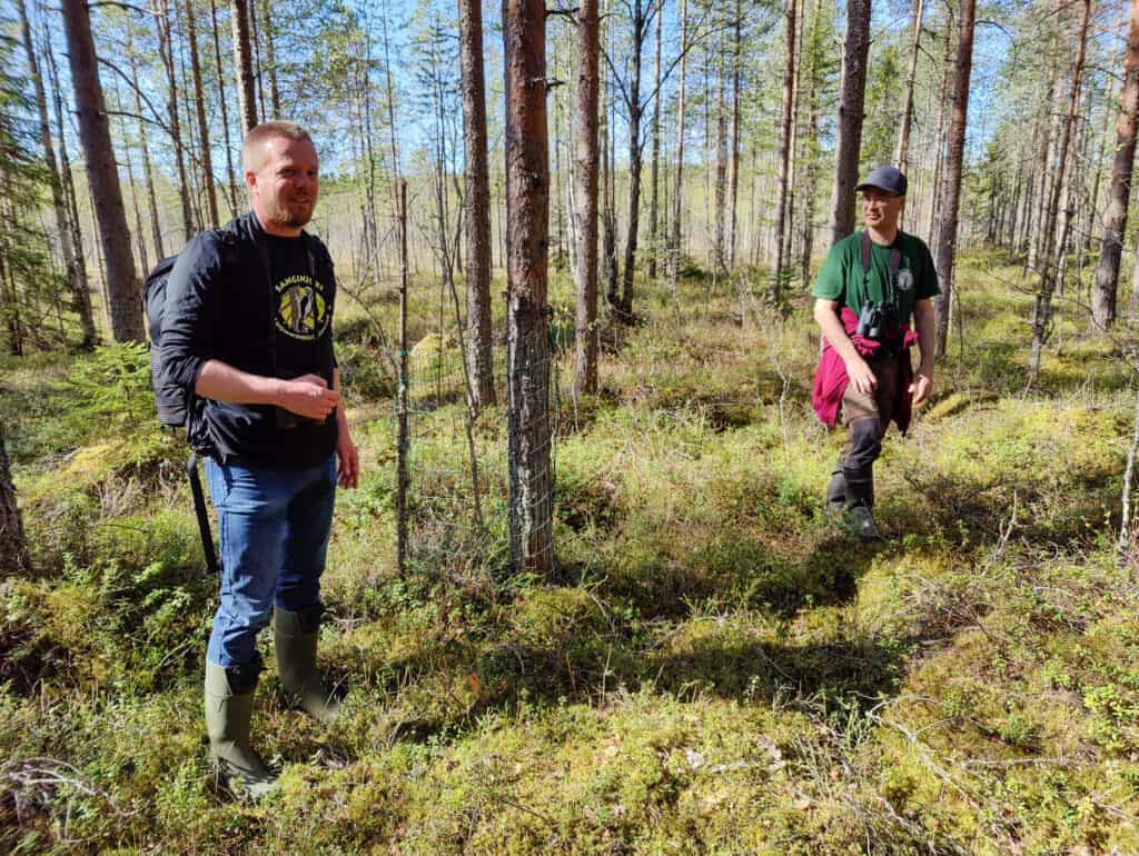 Varsinaisena retkipäivänämme aurinko paistaa jo varhain täydeltä terältä. Matkustamme museotiemäisesti kiemurtelevaa Sanginjoentietä kohti Kuovisuon suojelualuetta, jonka Luonnonperintösäätiö hankki suojeluun vuonna 2016. Kuovisuon eteläpuolella sijaitsee Sanginjoen ulkometsä – peräti 2500 hehtaarin yhtenäinen metsäalue, jonka Koneen Säätiö osti Oulun kaupungilta vuonna 2021 ja lahjoitti valtiolle suojelutarkoituksessa.