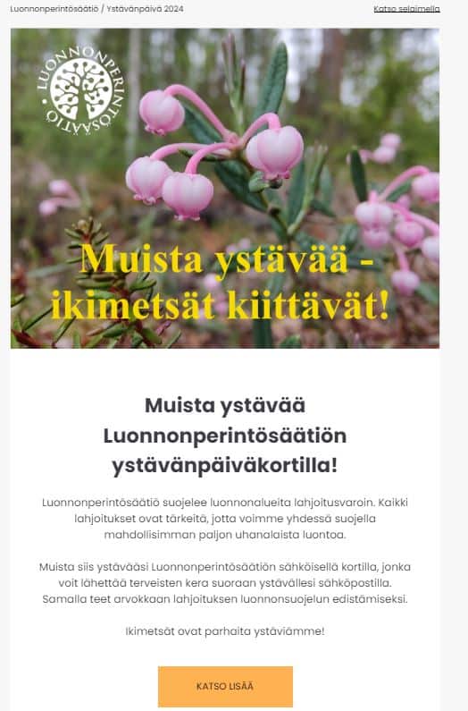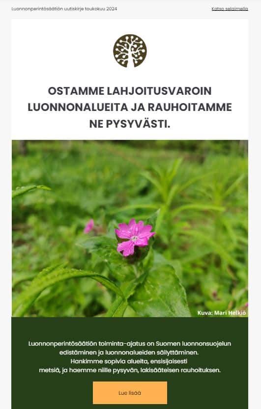 Tilaamalla uutiskirjeen saat säätiön uutiset sekä tietoa ajankohtaisista kampanjoista ja tuoreimmista suojelualueistamme suoraan sähköpostiisi. Luonnonperintösäätiön uutiskirje julkaistaan noin neljä kertaa vuodessa.