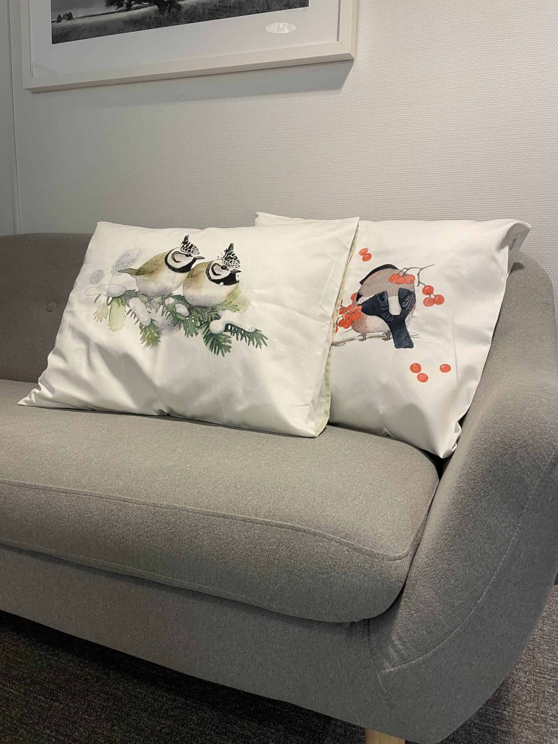Kotimainen tyynyliina (50 × 60 cm) – Töyhtötiainen tai Punatulkku. 100 % puuvillasatiinia, vesipohjainen painatus, turvalliset värit. Tukee Luonnonperintösäätiön metsien suojelua.